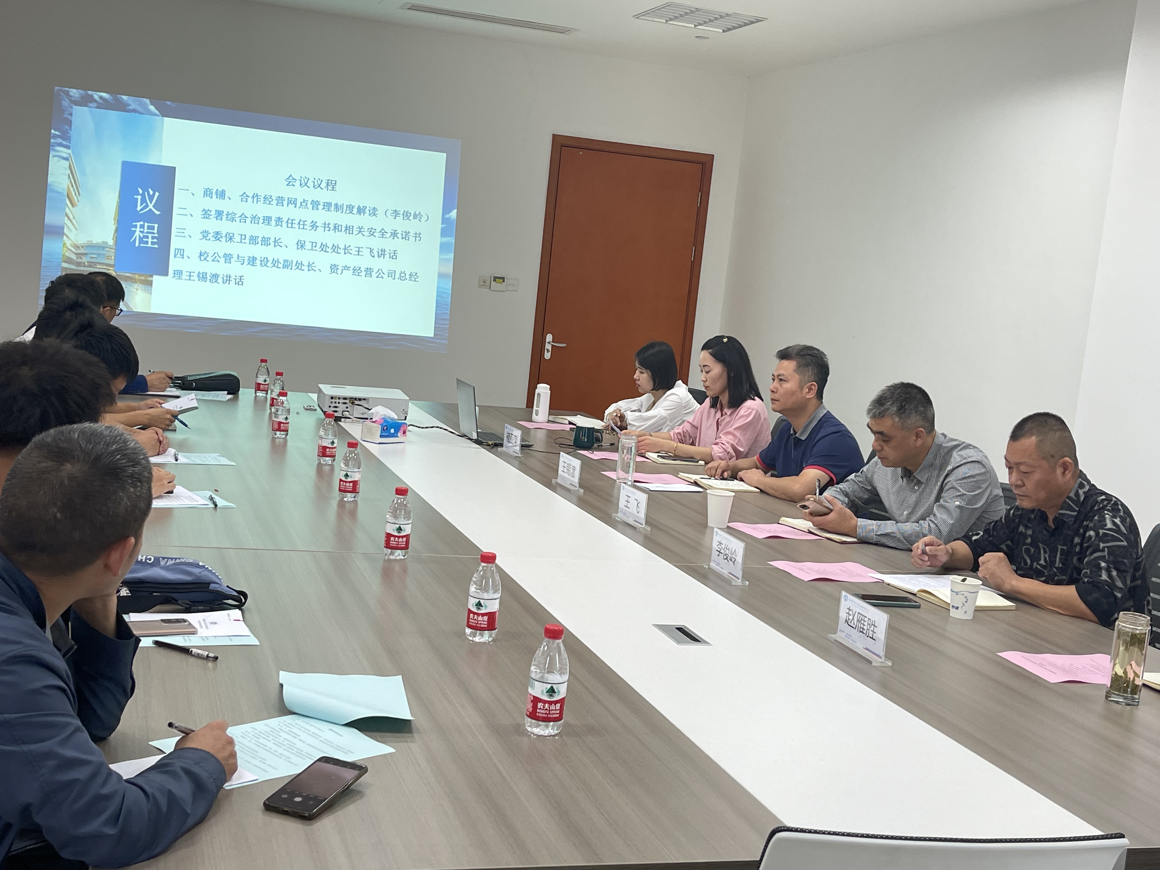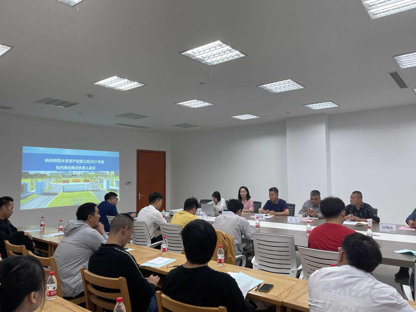2021年10月12日,杭州师范大学资产经营有限公司在仓前校区召开校内商业网点负责人会议。校公管与建设处副处长、资产经营公司负责人,党委保卫部部长、保卫处处长,资产经营公司相关工作人员及校内商业网点负责人参加会议。