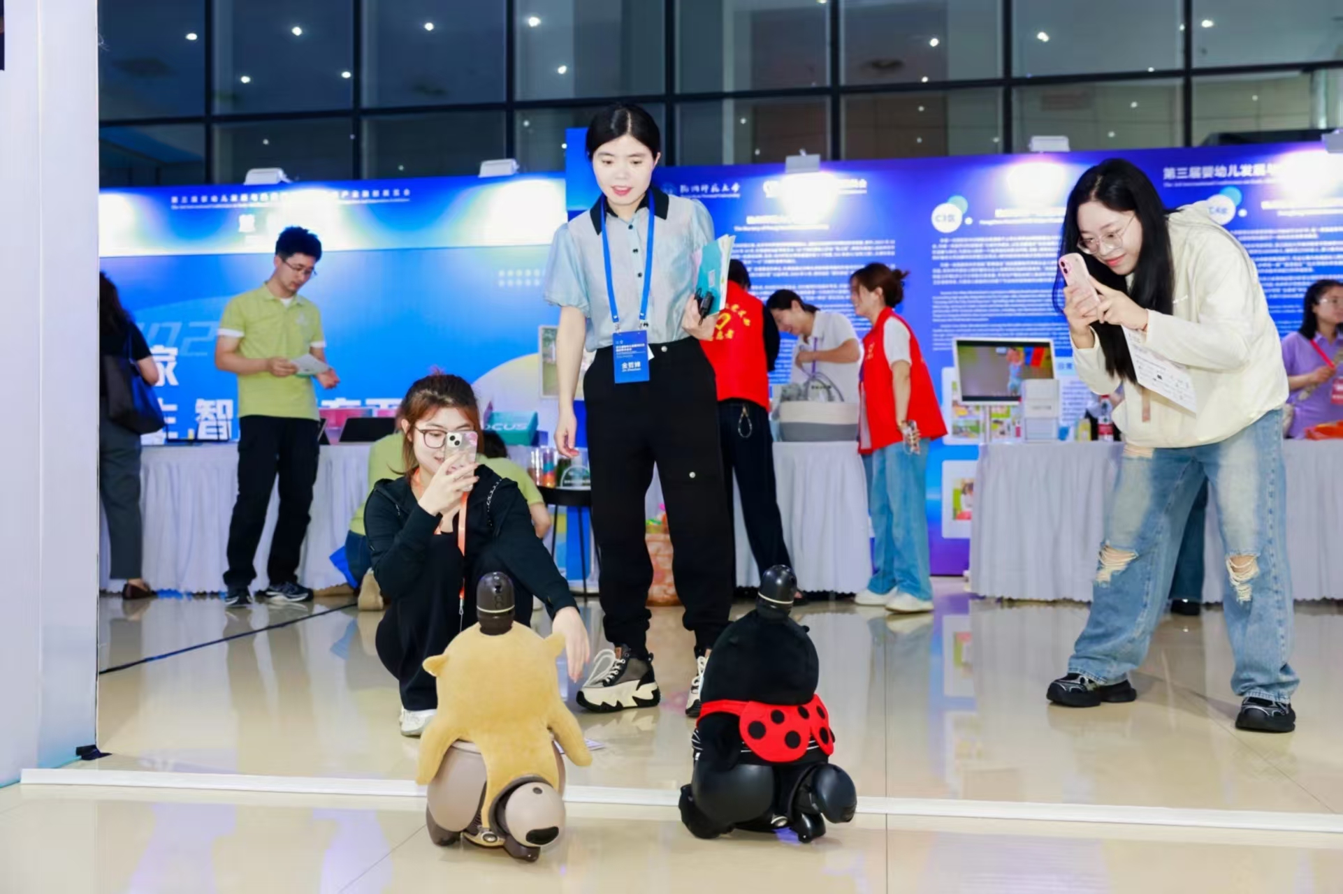 展览会现场热闹非凡、人头攒动,热烈的交流氛围贯穿始终,观众们一踏入展区就被丰富多彩的展品所吸引。在各展位前,观众认真翻阅宣传资料,上手触摸、查看实物展示,与参展商进行热烈交流。在托育机构展区中,欢声笑语不断,小朋友们正在迷你厨房、化妆镜前玩得不亦乐乎。“这些产品实在太实用了!”趁着孩子在乐高体验区专心搭积木,鲍女士得以安心观展。她兴奋地说:“像这款温奶器和净水器都是我家正在用的,今天又发现了好几样想添置的新产品,还买了好几盒钙片和维生素软糖”。说话间,鲍女士又蹲下身逗起了LOVOT的陪伴机器人。“太可爱了,我一招手它就走过来,还会伸手要抱抱,圆溜溜的眼睛一直看着我。”一转眼,鲍女士的相册里就存满了名为“晓晓”的机器人照片。