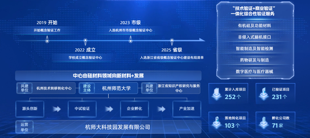 从探索起步到规范升级,中心走出了一条跨越式发展之路。2019年,学校以“推动科研成果转化为现实生产力”为使命,率先启动概念验证相关探索;2022年,正式组建概念验证中心,迈入规范化、体系化运营新阶段;2023年,成功入选杭州市市级概念验证中心,服务能力获得行业广泛认可;2025年,联合相关单位共建省级概念验证中心,成为省级主动布局单位,实现从“单点验证”向“综合生态服务”的质变升级。