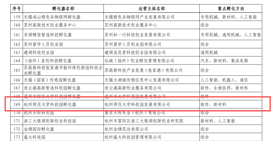 其中,杭州师范大学科技园孵化器认定科技型企业孵化器(标准级)。